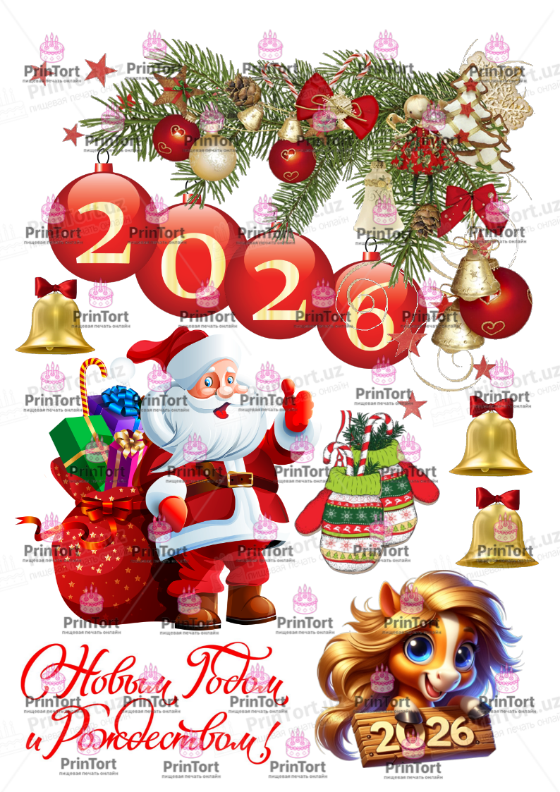 Сахарная и вафельная Картинка для торта «Новый Год (New Year)» — PT2037 | Пищевая печать на торте, сахарной, вафельной бумаге -> PrinTort.uz